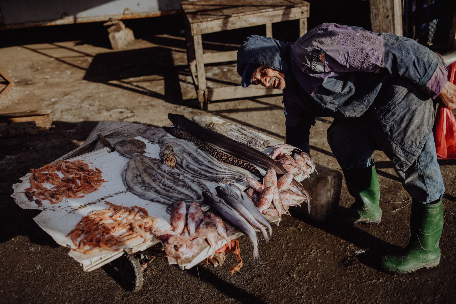 Über ihnen kreisen hunderte hungrige Möwen, die den Hafen mit ihrem Geschrei zu einem wahren Bilderbucherlebnis erfüllen. Überall stehen Fischhändler und handeln ihren Fang an provisorischen Ständen, während ringsherum Werkzeuge an den Schiffen erklingen, Kisten gestapelt und Netze geknüpft werden, Wellen gegen die Hafenmauern schlagen und Männer sich mit ihren schwer beladenen Karren einen Weg zwischen den Menschen bahnen. Es riecht nach Algen, Salzwasser und Fisch und einen schwachen Magen darf man beim Anblick der Tiere nicht haben. Doch die goldene Frühlingssonne lässt die blassen Farben zwischen Dreck und Tod erstrahlen, Schuppen glitzern wie Sterne und Plastikplanen werfen bunte Schatten auf die dreckigen Tische. Was entsteht, ist ein morbider Charme einer spannenden Szenerie, der man sich kaum entziehen kann, ganz gleich wie sehr man sich am Anblick der Fischinnereien stört.
