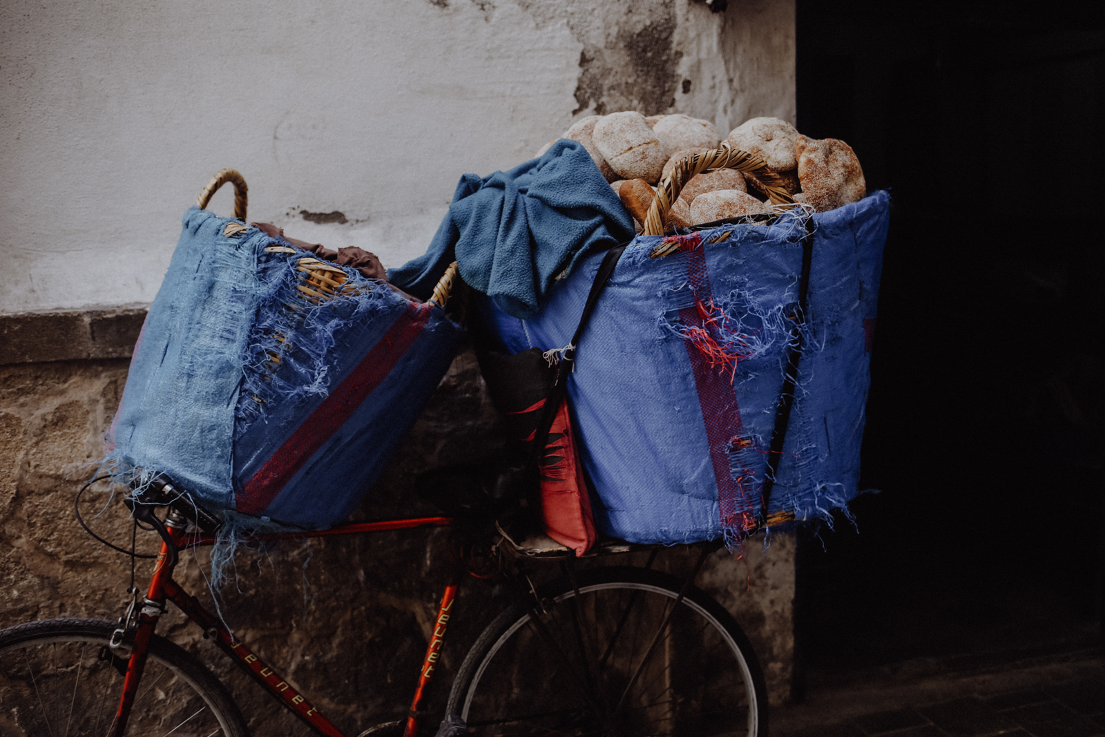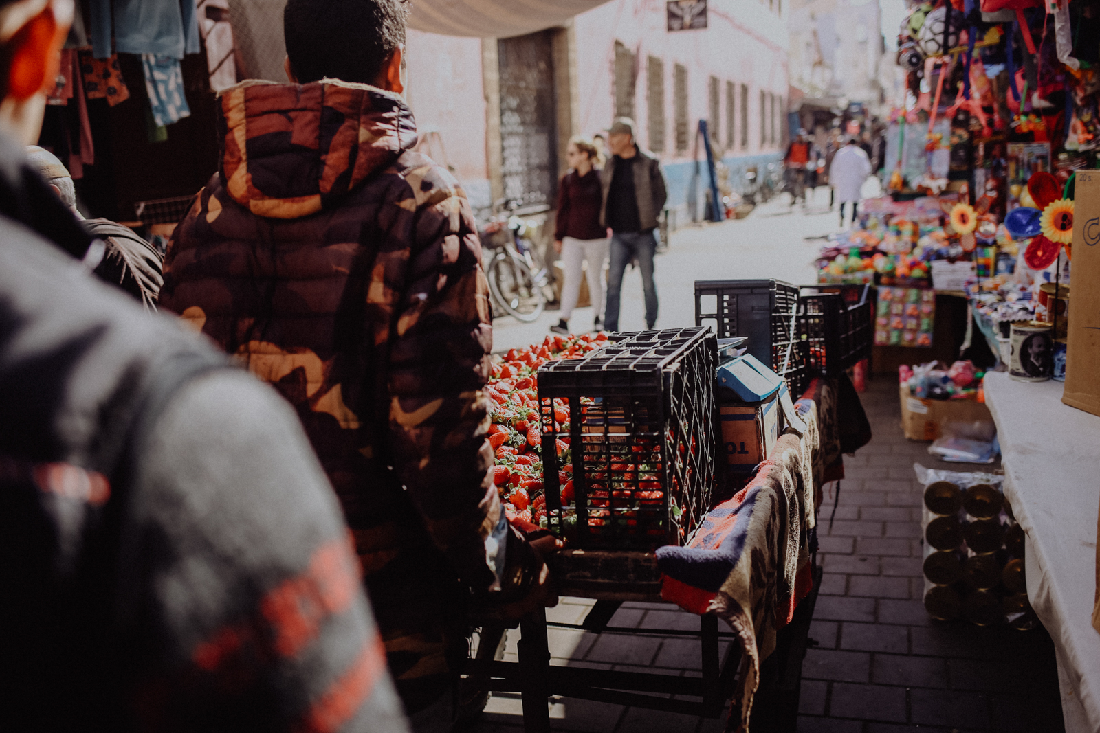 Schon der schummrig-golden beleuchtete Eingangsbereich mit seinen Mosaiken, orientalischen Teppichen und dunklen Möbeln rings um den erleuchteten Brunnen versprach, dass man auch in dieser Riad schlafen würde wie Prinzessin Jasmin in ihrem Palast. Nach der üblichen Tee-Zeremonie zur Begrüßung bezog ich mein Zimmer, das meine leisen Erwartungen auch nur bestätigte. Die Zimmer sind sehr authentisch eingerichtet, einfach aber sehr hübsch dekoriert. Auf dem Dach des Gebäudes befindet sich außerdem eine gemütliche Terrasse, um am Abend die letzten Sonnenstrahlen zu erhaschen, die dann schon längst nicht mehr die Gassen zwischen den hohen Mauern der Gebäude erreichen.