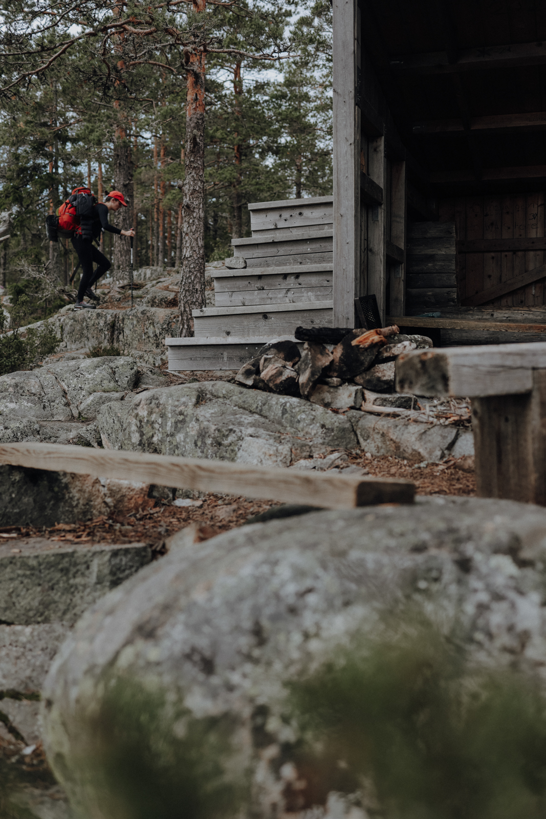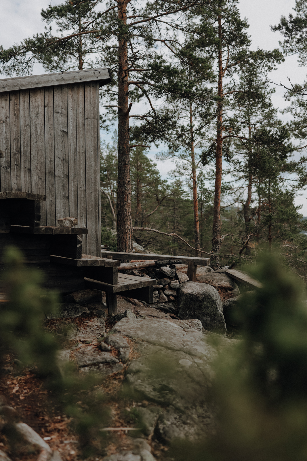 Schon nach wenigen Kilometern, als wir Dörfer, Brücken und Straßen hinter uns gelassen haben, nahm uns der Wald in Empfang, der uns die nächsten 7 Tage begleiten sollte. Meine Zweifel, ob ich nicht doch den falschen Weg gewählt hatte (es standen mehrere zur Auswahl und zum Höga Kustenleden gab es nur wenig Informationen), zerstreuten sich keine zwei Stunden nach unserem Start, als wir zum ersten Mal in die Felslandschaften mit ihren Kiefern eintauchten und den ARKNAT Shelter “Over the Edge” erreichten. Ganz wie der Name es vermuten lässt, eröffnet sich an ihm der erste Ausblick über die spektakuläre Schärenlandschaft.