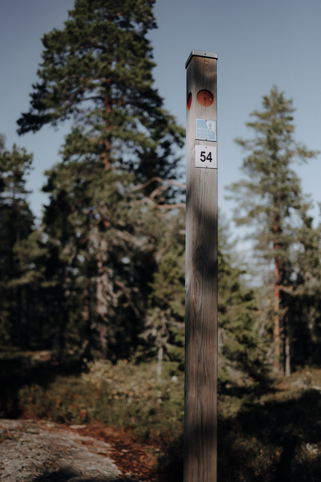 Ein bisschen bleibt einem der Wald anschließend noch erhalten, bevor man die laute E4 erreicht und ihr gezwungenermaßen bis nach Docksta folgt. Doch keine Sorge: Diese Etappe ist die einzige des Höga Kustenleden, auf der man so lang an einer so großen Straße läuft. Hier heißt es Kopfhörer in die Ohren und laufen, laufen, laufen! Einen Kilometer vor der Friluftsbyn verlässt man die Straße direkt in Richtung Skuleberget.