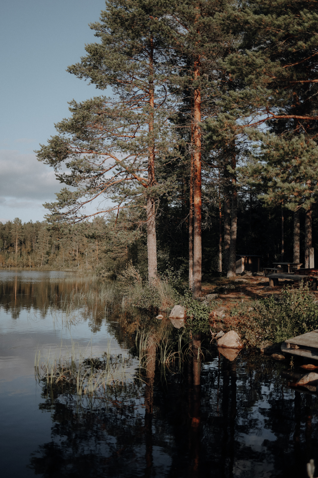 Binnen weniger hundert Meter hinter dem Ortsausgangsschild ist man jedoch zurück in den liebgewonnen Fels- und Waldlandschaften. Mehr noch: Schon nach wenigen Minuten kündigen Holzbohlenwege ein Feuchtgebiet an, das sich wenig später als spiegelglatter See entpuppt. Während wir bis hierher recht zügig unterwegs waren, ist das niedliche Freilichtmuseum am See mit seinen vielen Picknickbänken der ideale Ort für eine lange (Bade)pause.