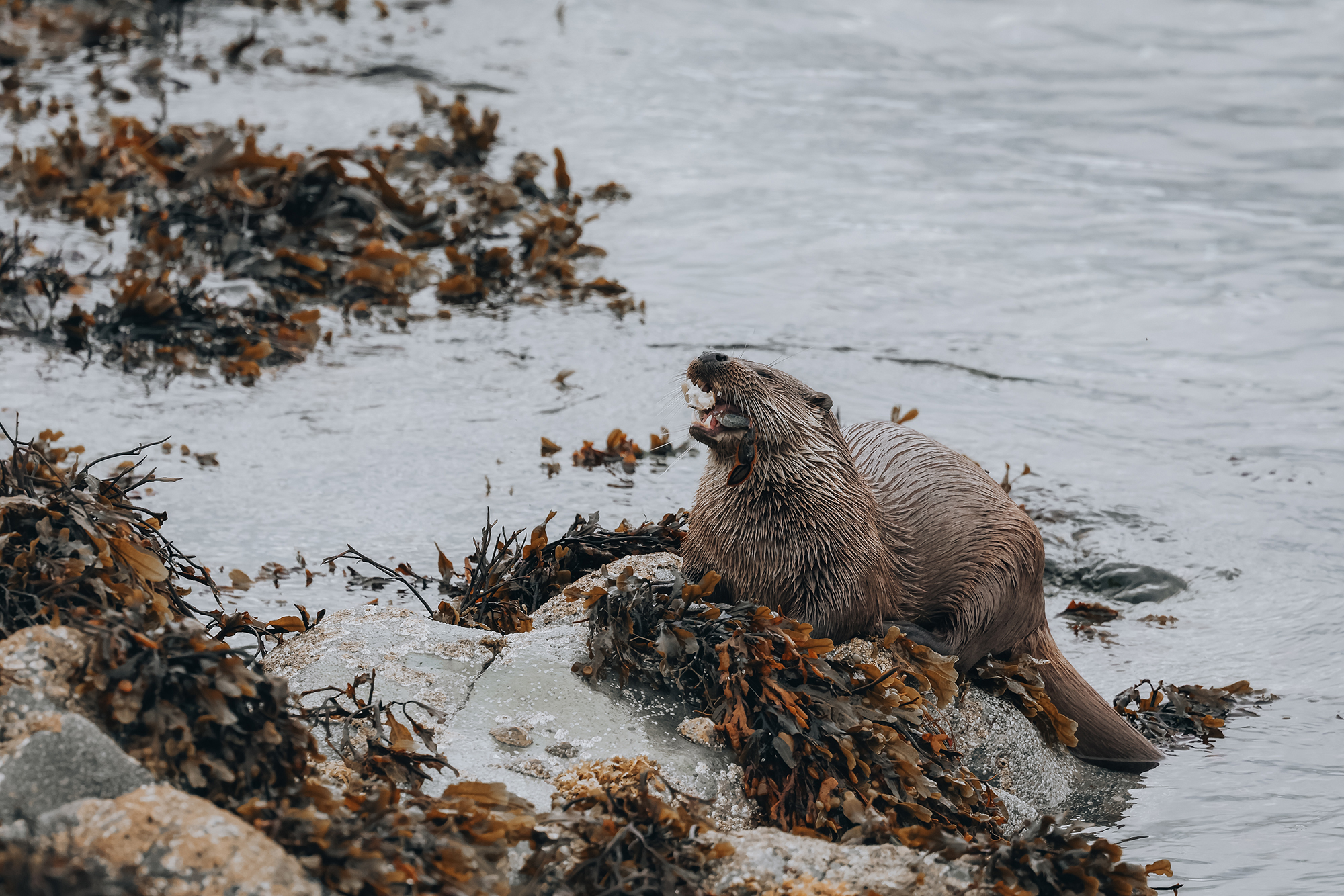 Und siehe da: Bereits mein zweiter Versuch zahlte sich aus – und wie! Ich konnte meinen Augen kaum trauen, als ich auf einmal vor dem Felsen, hinter dem ich mich versteht hielt, kreisförmige Wellen auf der Wasseroberfläche wahrnahm. Während ich noch versuchte, meine Erwartungen zu regulieren, indem ich mir gedanklich erzählte, dass diese auch von einer Ente stammen könnten, tauchte ein Otter auf – und in seinem Maul eine riesige Krabbe – größer als sein Kopf!