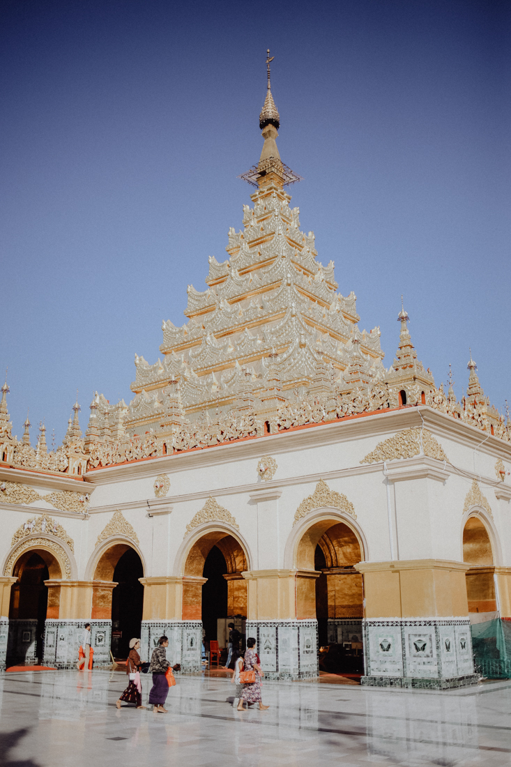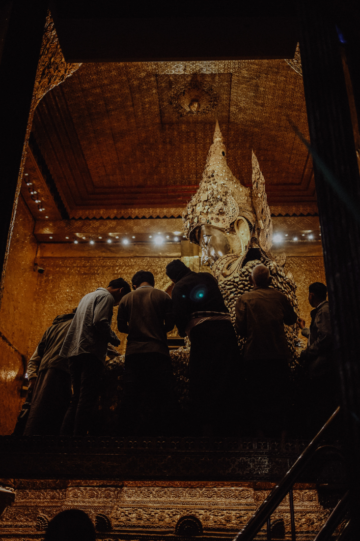 In Myanmar gibt es drei besonders heilige Pagoden, die jeder Birmane einmal in einem Leben besuchen soll: Die Shwedagon Pagode in Yangon, der Goldene Felsen auf halber Strecke zwischen Yangon und Hpa-an und die Mahamuni Pagode in Mandalay. Jeden Tag strömen deshalb tausende Buddhisten in die Pagode im Mandalay, um dort dem vier Meter großen sitzenden Buddha ihre Ehre zu erweisen. Das tun die meisten (leider nur Männer, Frauen dürfen tatsächlich nur zuschauen), indem sie den Körper des Buddhas mit Blattgold bekleben. In den letzten Jahrzehnten hat dieses Ritual dazu geführt, dass der Buddha inzwischen durch seine 15 Zentimeter dicke Goldschicht ziemlich füllig geworden ist und erschreckend lange Finger bekommen hat.